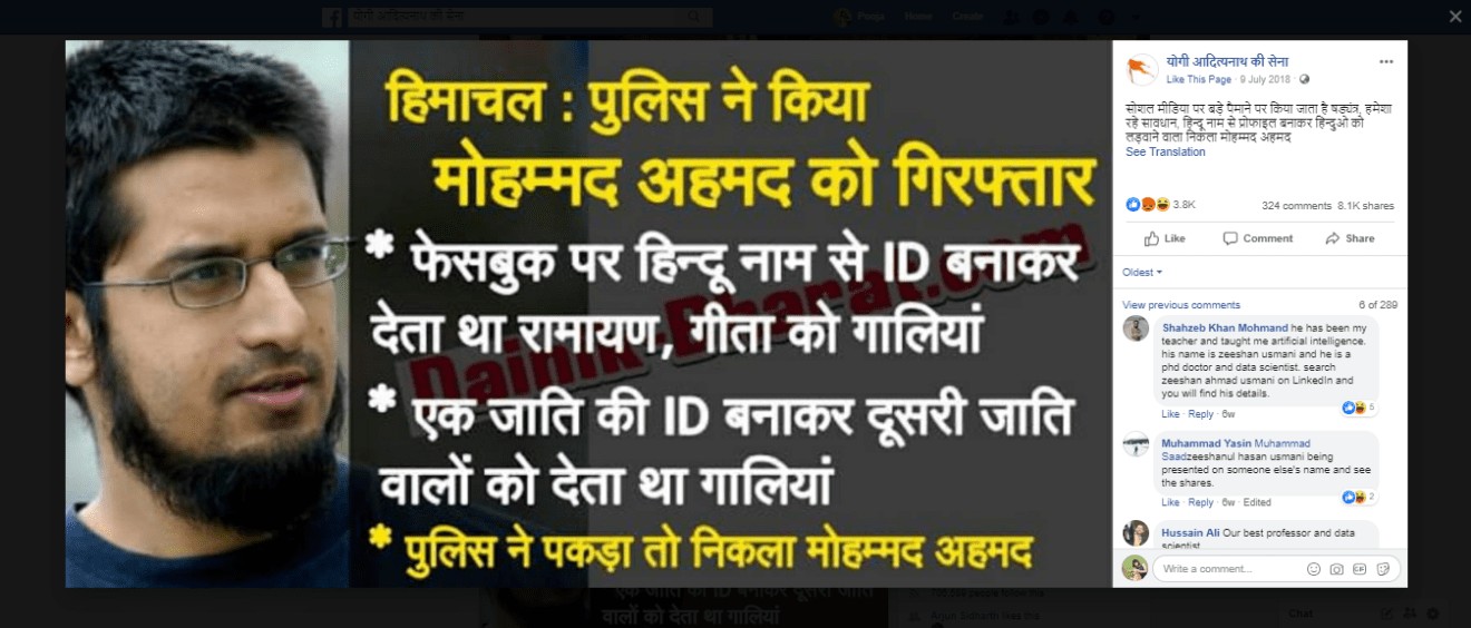 Alt News had earlier debunked this claim as part of an exposé on Facebook page ‘Yogi Adityanath ki Sena.’ We had found that the misinformation was created lifting a photograph of a man named Zeeshan-ul-hassan Usmani who describes himself as a data science, blockchain and AI consultant on Facebook and is from Pakistan. The man has an account on Twitter as well and had posted on Facebook the same photograph used by ‘Yogi Adityanath ki Sena.’Pradesh