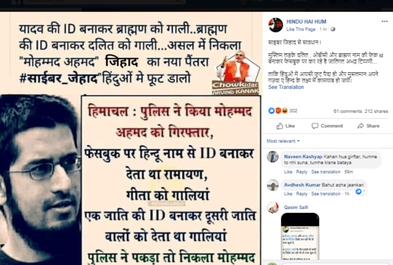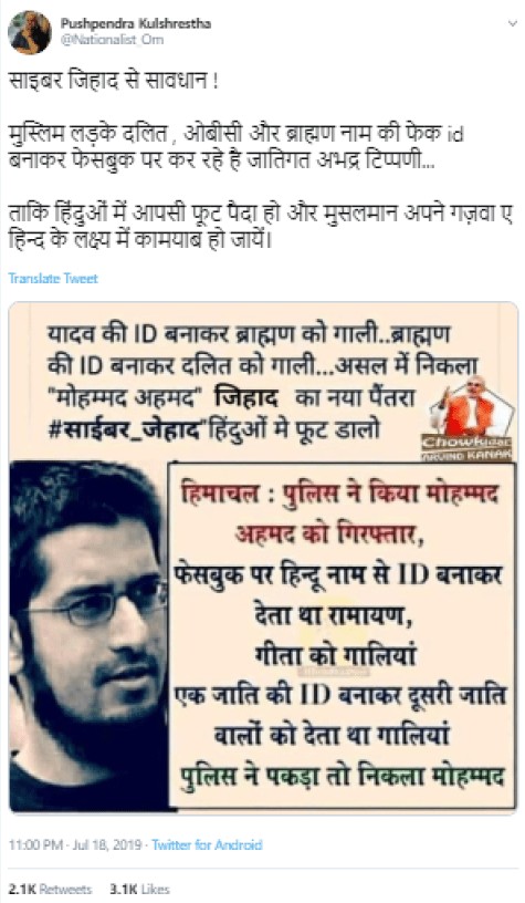 A Twitter handle @Nationallist_Om which is a parody account of journalist Pushpendra Kulshrestha shared an image of a bearded man with the claim that Muslims are making fake IDs with Hindus names from different castes to post casteist remarks on social media to spark a divide in the Hindu community. “साइबर जिहाद से सावधान! मुस्लिम लड़के दलित , ओबीसी और ब्राह्मण नाम की फेक id बनाकर फेसबुक पर कर रहे है जातिगत अभद्र टिप्पणी… ताकि हिंदुओं में आपसी फूट पैदा हो और मुसलमान अपने गज़वा ए हिन्द के लक्ष्य में कामयाब हो जायें। Beware of cyber Jihad! Muslim boys are making fake IDs using Dalit, OBC and Brahmin names to post casteist remarks on Facebook…so that Hindus are divided and Muslims succeed in their goal of conquering India.” At the time of writing this article, Nationallist_Om‘s tweet was liked over 3,000 times and retweeted over 2,000 times (archive).