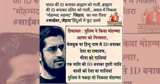 The tweet carried an image with a message attached to it that said – “यादव की ID बनाकर ब्राह्मण को गाली..ब्राह्मण की ID बनाकर दलित को गाली…असल में निकला “मोहम्मद अहमद जिहाद का नया पैंतरा #साईबर जेहाद’ हिंदुओं में फूट डालो। (Abusing Brahmins by using a Yadav’s ID…abusing Dalits by using a Brahmins ID. In reality, he is Mohammed Ahmad. This is a new Jihad #CyberJihad to divide Hindus.)”