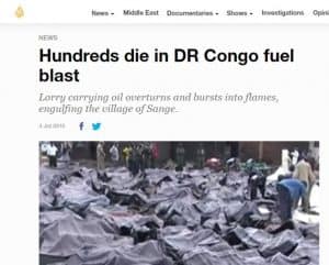 In June 2010, at least 230 people were killed when a fuel tanker overturned and exploded in Sange village, DR Congo. The incident was reported by several international media outlets, including Al JazeeraReutersNew York TimesCNNBBC and more.