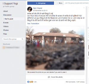 This message is viral on social media with an accompanying picture of charred bodies, suggesting that the image pertains to the 2002 Godhra train burning. From a Facebook group, I Support Yogi, the message has over 1,000 shares.