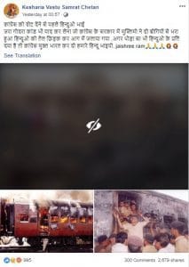 “कांग्रेस को वोट देंने से पहले हिन्दुओ भाई जरा गोधरा कांड भी याद कर लेना जो कांग्रेस के सरकार में कांग्रेस के ही मुस्लिमों ने दो बोगियों से भरा हुआ हिन्दुओ को तेल छिड़क कर आग में जलाया गया था ,अगर थोड़ा सा भी हिन्दुओ के प्रति दया है तो कांग्रेस मुक्त भारत कर दो हमारे प्यारे हिन्दू भाइयो। Before voting for Congress, Hindu brothers, remember the Godhra massacre where Congress Muslims in the Congress government had poured oil on Hindus in two [train] compartments and burned them. If you love Hindus even a little bit, rid India of Congress, our loving Hindu brothers.”