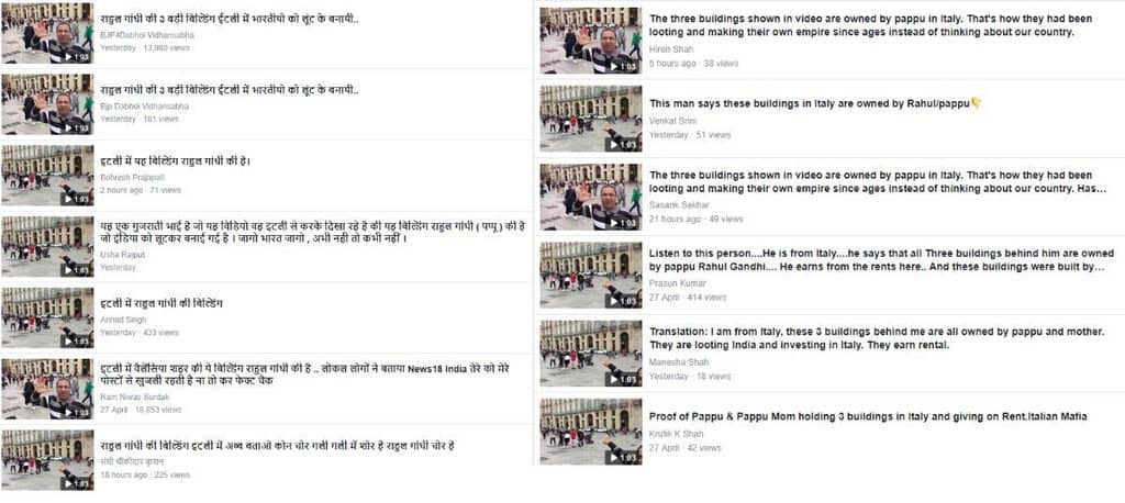 The video is viral in both Hindi (keywords – बिल्डिंग राहुल गांधी) and English (keywords – Pappu Italy buildings).
