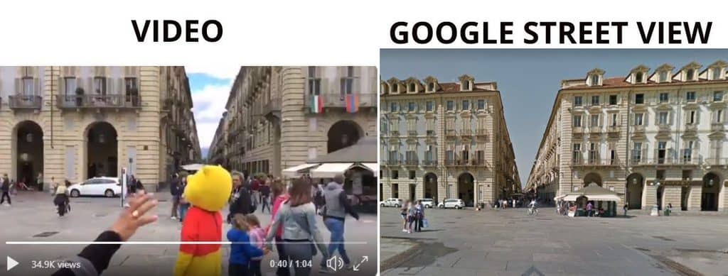 The collage below shows the Google street view of the Royal Palace in Piazza Castello, juxtaposed with a screengrab of the palace as seen in the viral video.