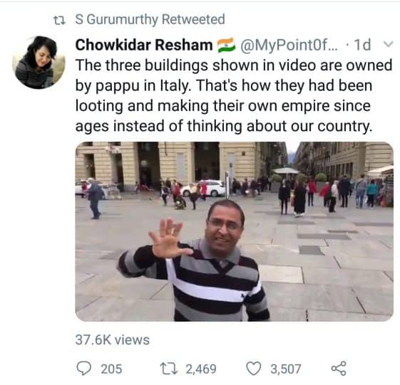 The three buildings shown in video are owned by pappu in Italy. That’s how they had been looting and making their own empire since ages instead of thinking about our country. pic.twitter.com/m22QiHbUrh