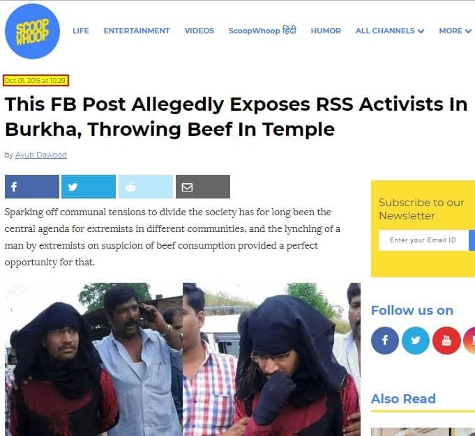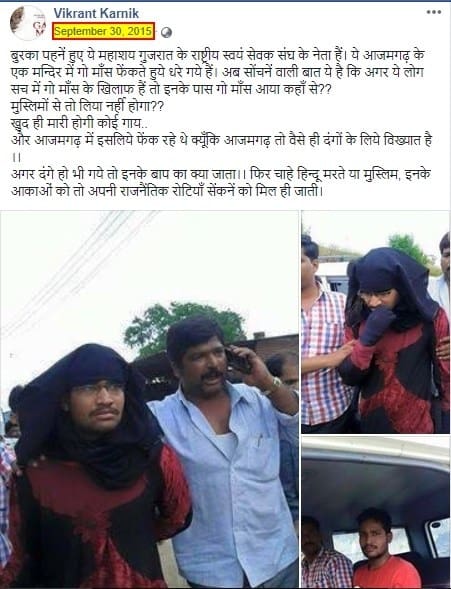 Alt News found that photograph had first appeared in the public domain in September 2015. On September 30, 2015, three photographs had been posted by a Facebook user along with the narrative that the person in the burqa is a RSS leader from Gujarat who was caught red-handed throwing beef inside a temple. This is the earliest instance of the photo appearing online, that Alt News could find.
