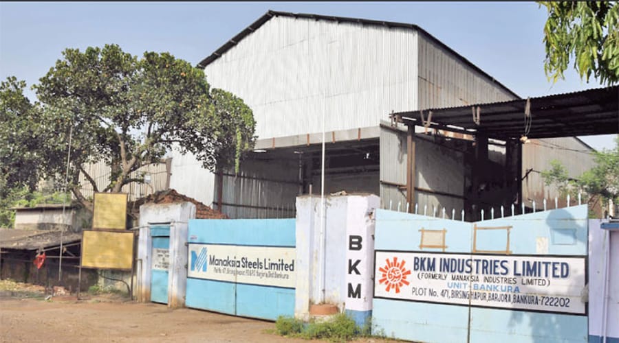 The locked gates of BKM industries and Manaksia Steel factories are located side by side. Today the only thing new about the factories is the fresh coat of blue paint on the gates.