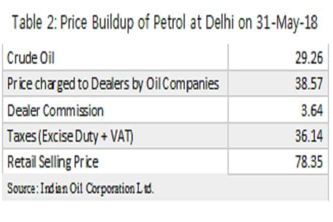 But who’s inflicting this burden, in other words, who’s pocketing this gap? Indian Oil Corporation provides latest data on the breakup of retail prices which shows the share of the government in the overall price paid by the consumers (table 2). Close to half of what we pay goes as taxes to the government (central and state combined).