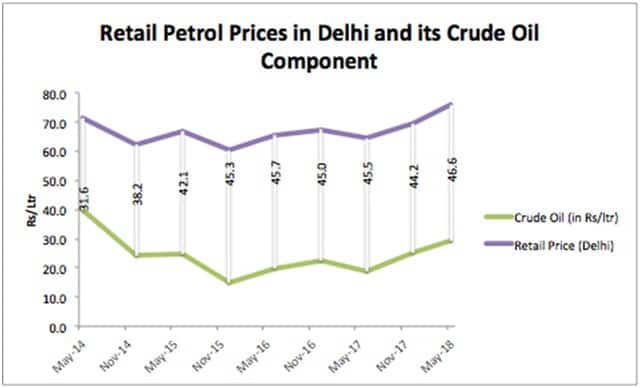 The price rise in general and of oil, in particular, was one of the reasons for the anger against the UPA government. While the crude oil prices were quite high during UPA-2 (USD 106.85 per barrel in May 2014 before the UPA demitted office), they have fallen dramatically over the better part of the tenure of Modi government (in the range of USD 30s). Yet the trend of retail prices is exactly the opposite. Of course, for the Indian public, it is the price of crude oil in INR and not dollars which matters. If the rupee gets weaker against the dollar, as it has during the current government, the Indian consumers receive limited benefits from the declining international oil prices.
