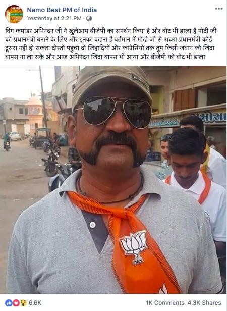 A viral post on Facebook claims that Wing Commander Abhinandan Varthaman has openly come out in support of the BJP and voted for the party in the ongoing Lok Sabha election. The post has a photograph of a person who looks similar to Wing Commander Varthaman, and is seen sporting a saffron scarf with the BJP symbol imprinted on it.