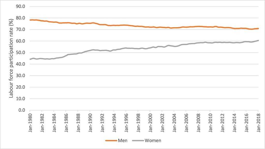 Over the past three decades, female participation rates in Australia have increased dramatically — from around 40 per cent to 60 per cent — while male participation rates have fallen from 80 per cent to 70 per cent.