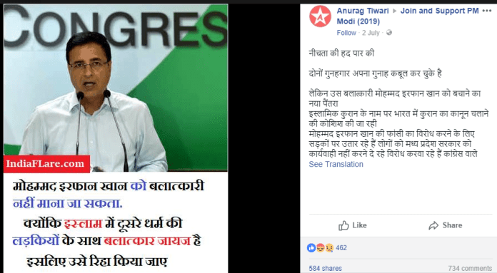 Indiaflare.com has also attributed a manufactured quote to Randeep Singh Surjewala, claiming that the Congress spokesperson said, “Mohammed Irfan cannot be considered a rapist because Islam permits the rape of women from another religion. He should be released.” This was the same narrative pushed by the fake news website in its article on ‘Muslims demanding the release of Mandsaur rapist.’ The fake quote attributed to Surjewala has been shared on Join and Support PM Modi (2019) by one Anurag Tiwari, whose account seems fake as there is no activity on the profile. It has more than 500 shares.