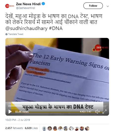 Zee News Falsely Claims Mahua Moitra Plagiarised Her Maiden Parliament Speech
